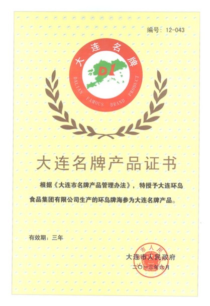 慶祝環(huán)島牌海參被大連市人民政府授權(quán)為“大連名牌產(chǎn)品”